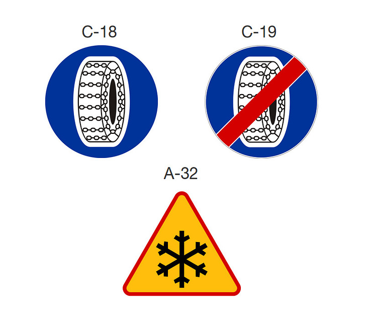 Zgodnie z rozporządzeniem Ministrów Infrastruktury oraz Spraw Wewnętrznych i Administracji z dnia 31 lipca 2002 r. w sprawie znaków i sygnałów drogowych (Dz. U. z 2002 r., nr 170 poz. 1393), do stosowania łańcuchów śniegowych odnoszą się w mniejszym lub większym stopniu następujące znaki drogowe: